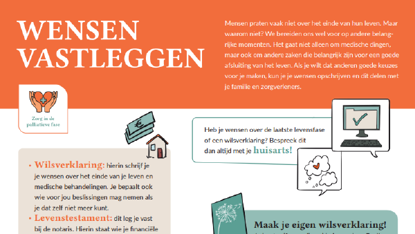 Door uw persoonlijke wensen vast te leggen, kunnen in spoedeisende situaties keuzes worden gemaakt die aansluiten bij uw wensen. Het is dus naast het nadenken over uw persoonlijke wensen, belangrijk om deze te bespreken met mensen die werken in de zorg (huisarts, specialist, verpleegkundige) én dat u ze vastlegt. Zo zijn ze op ieder moment beschikbaar en het voor iedereen duidelijk is wat uw wensen zijn. Zorg er ook voor dat de informatie vindbaar is voor uw naasten en dat u uw wensen bijvoorbeeld jaarlijks nog eens bekijkt en waar nodig aanpast.